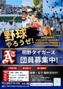 初夏の気配も漂わせる春風が心地いい3月最終週Weekend。野球の世界においてもWBCは閉幕したものの、センバツ甲子園は佳境を迎え、プロ野球そしてメジャーリーグも開幕と、大いに盛り上げってきた春休みの入口、先週土曜日も明野タイガース低学年チームは松原小学校で元気に1日練習。そこに2名のリピーター体験生が練習に参加してくれました。午前の部には新2年生S真クン。午後の部には新3年生T一朗クン。二人とも参加回数を重ねているだけあって、既にメンバーともすっかり慣れて練習の合間などの休憩TIMEにはじゃれあうシーンも見られるなど、明野タイガース練習風景にすっかり溶け込んでいる感10,000%。それぞれにこれまでの体験練習での上達度を踏まえたプログラムで今回は体験練習に取り組んでもらいました。2人の現在地は「野球って楽しい」・・・もうこの感覚は十二分に抱いてくれていると思われますので、次のSTEPとして「野球スキルが上達してゆくってキモチいい」・・・この感覚をたっぷりと味わって欲しいフェーズに突入していると申し上げて良いでしょう。午前の部、S真クン、今週のテーマは「バットスイング」。しっかりと振ってボールを遠くまで飛ばす。その為の振り方や構え方などを実践してもらいました。ラストの監督とのガチ対決!!いい当たりたっぷり飛ばしてたぜS真クン!!ご自慢の饒舌なトークも止まらないご機嫌ぶりで帰路につかれてゆく姿が印象的でございました。そして午後の部、T一朗クンは参加回数もかなり重ねてきており、ここはイッチョ、メンバーと同じ練習をやってみようかあ~。てなわけでメンバーに交じって、ガッツリやりました。ズバリ!フライキャッチ練習!!我らがN野コーチの必殺アイテムを使用してのフライキャッチ練習。この学童野球の世界にそれなりに関わっている方ならおわかりでしょうが、このフライキャッチは相当、練習を重ねないと難しいPLAYであり、体験練習生のメニューとしては異例なのですが、T一朗クン!もうあと少し・・・てな段階までのPLAYっぷりでしたね。怖がらずに落下点でグローブを差し出すことは勇気もいるのですが、その食いつきたるや既にメンバー顔負け。Mission Completeは次回にとっておこうか!!そんなこんなでスキルアップフェーズも回を重ねるごとにのめり込んできている様子がこちらにも伝わってきていますよT一朗クン&S真クン!!また次週の参加もお待ちしています!!